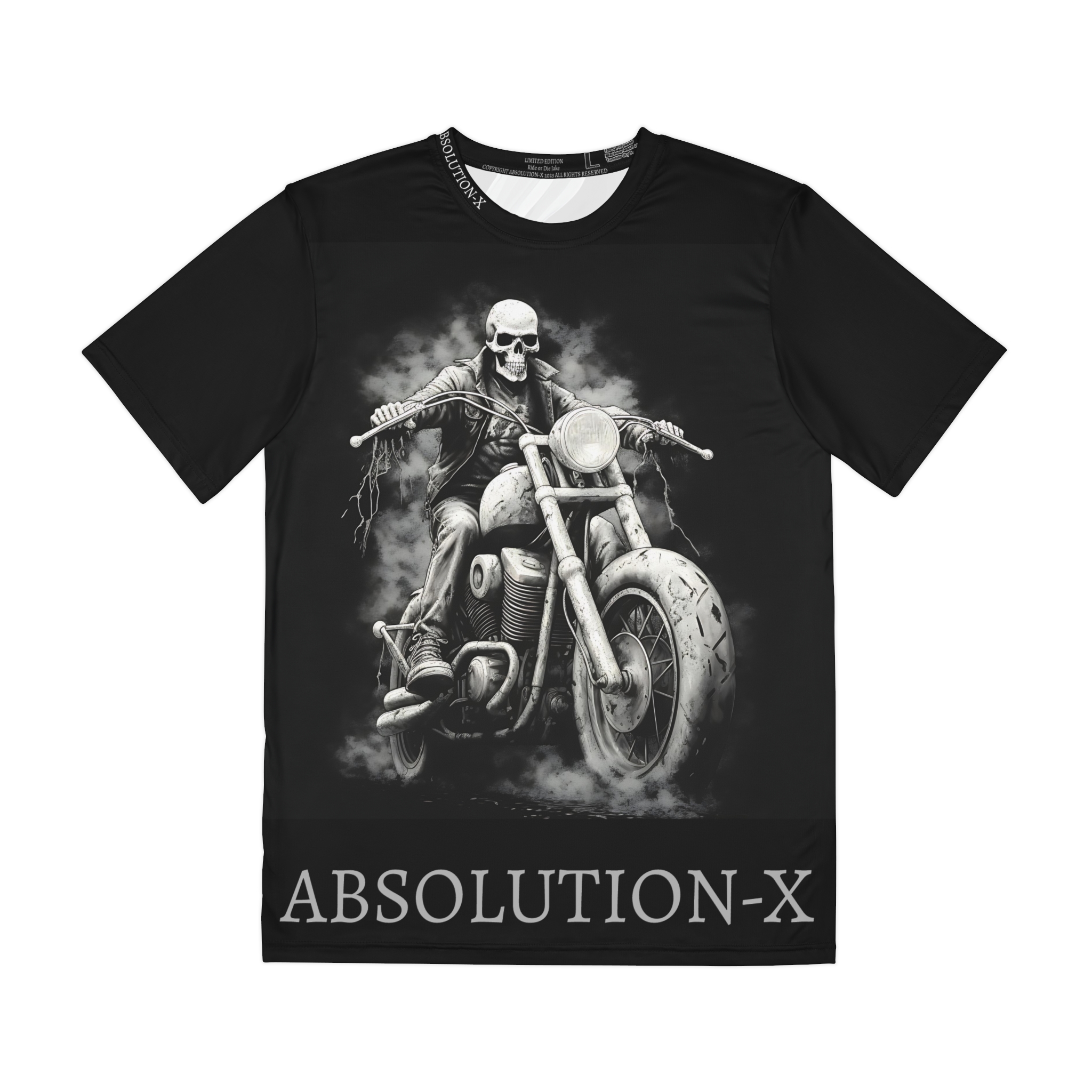 The Ride or Die Collection, Limited Edition Jake, Ride or Die Unisex Poly Tee will be an instant standout in anyone’s wardrobe. Made with 100% silky smooth, brushed polyester, the Ride or Die Jake t-shirt is super comfy, and designed to be shrink and fade-resistant. This tee was created to be a versatile and stylish companion for all your casual appearances. With its uniquely textured, thick, microfiber-knit fabric, this t-shirt bears a premium, soft feel that remains lightweight and highly breathable – the perfect combo for a hot day or layering. Every ABSOLUTION-X garment is unique. Designs are not screen printed, they are printed into the fabric, the panels and pieces of the garment are cut by hand and assembled and sewn by hand by expert artisans. Every ABSOLUTION-X design is a limited edition and throughout the limited run of the design, the design is changed in different ways so that our garments are even more unique.